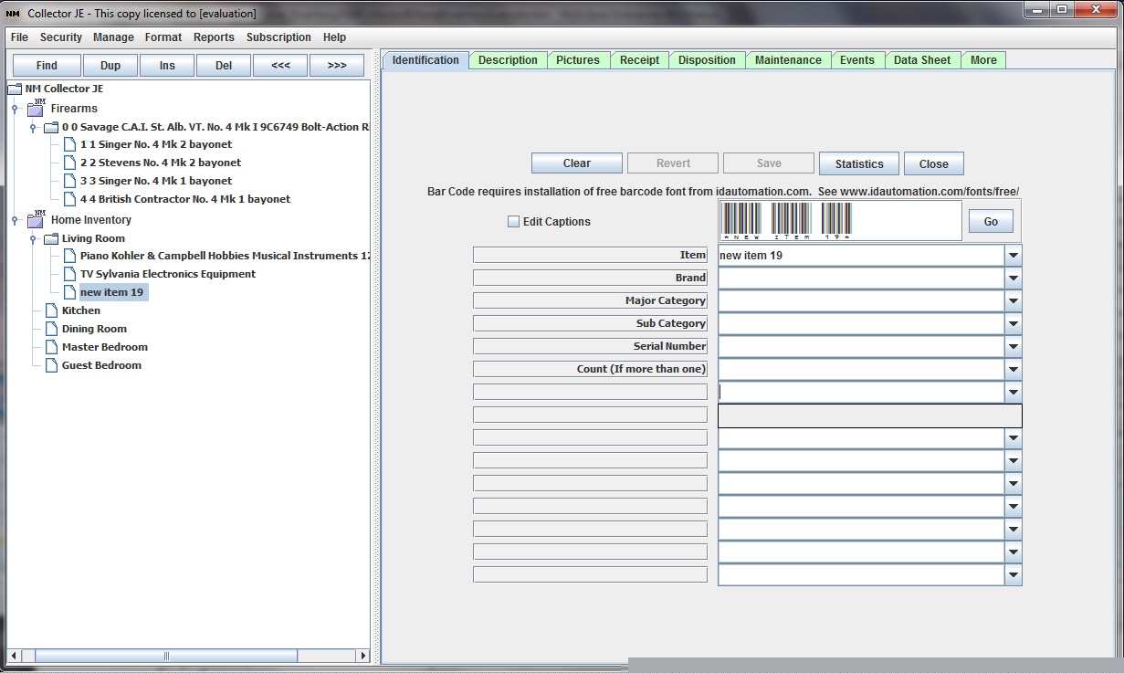 Home Inventory collection type is selected in our tree view.� Now we click the �Ins� button and a new